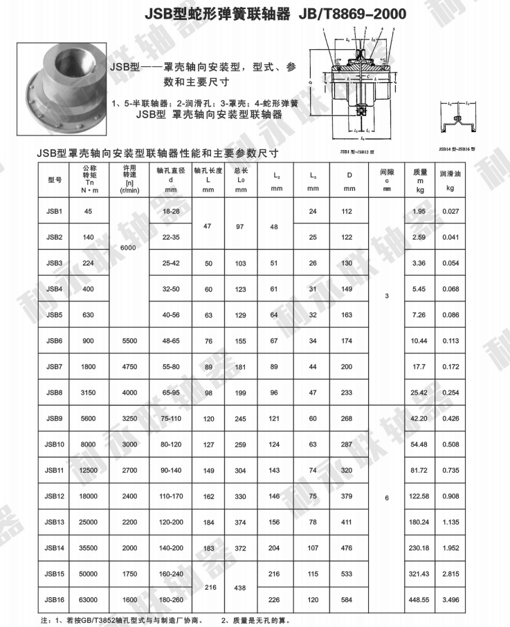 4、 噪聲低,潤滑好 5、 結構簡單,裝拆方便 6、 允許有較大的安裝偏差 J 型蛇形彈性聯軸器(JB/T 8869-2000)